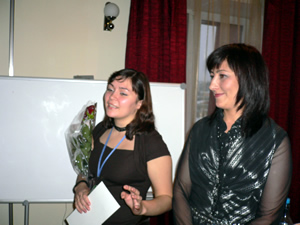 Леонидова Елена вручает памятный подарок Александру Скороходу